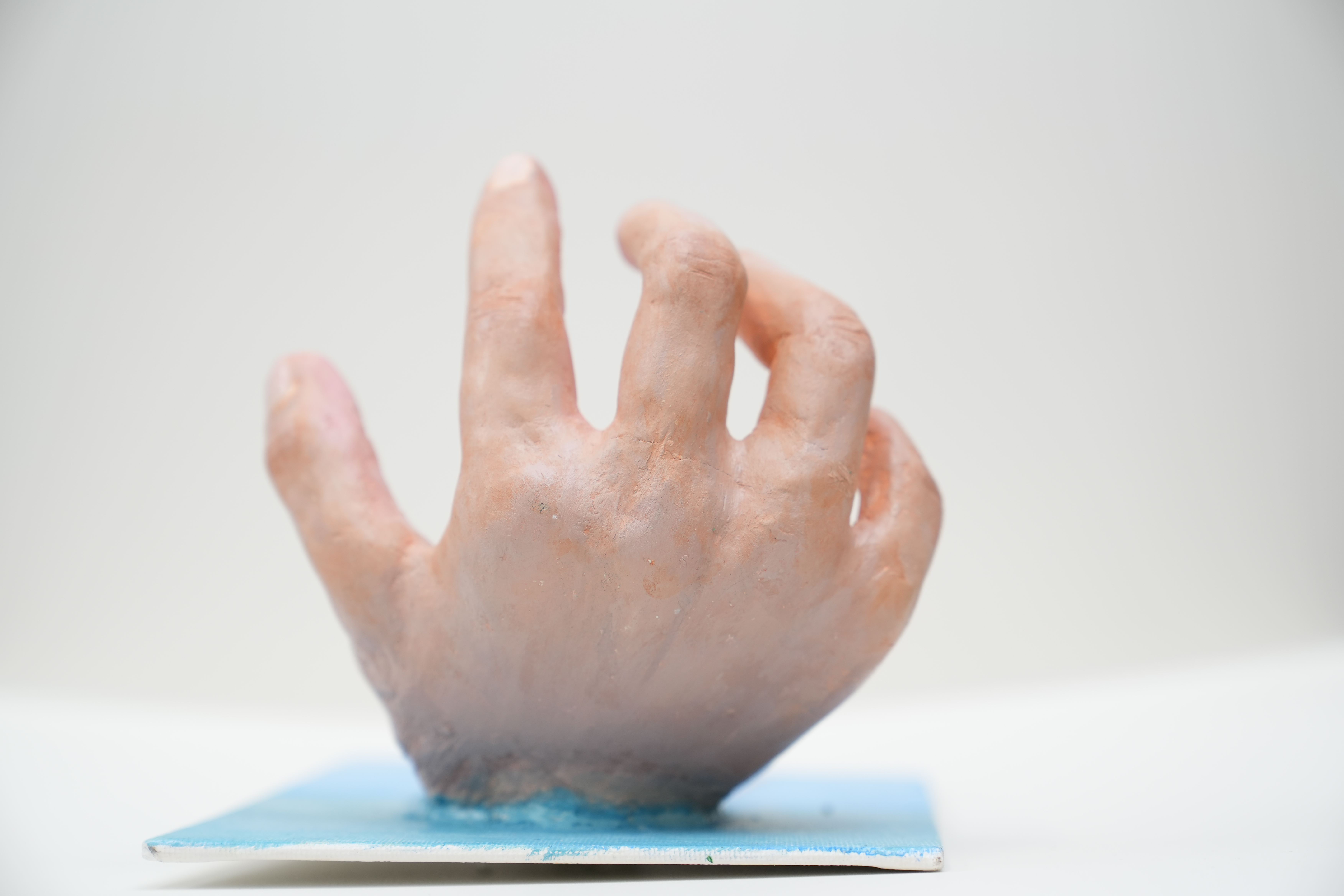 My sculpture of the human hand, crafted with plastic tools, aluminum foil, clay, and acrylics, captures the intricate beauty and functionality of this divine design. The hand, secured to the canvas with clay and nails, is detailed to reflect natural skin textures and painted with a water effect. Seashells, made from leftover clay and painted to retain their organic essence, symbolize nature's delicate wonders. The blurred ocean background emphasizes the hand and shells, reflecting my admiration for the divine artistry in nature and humanity. This piece is a humble attempt to encapsulate the essence of creation in tangible form.