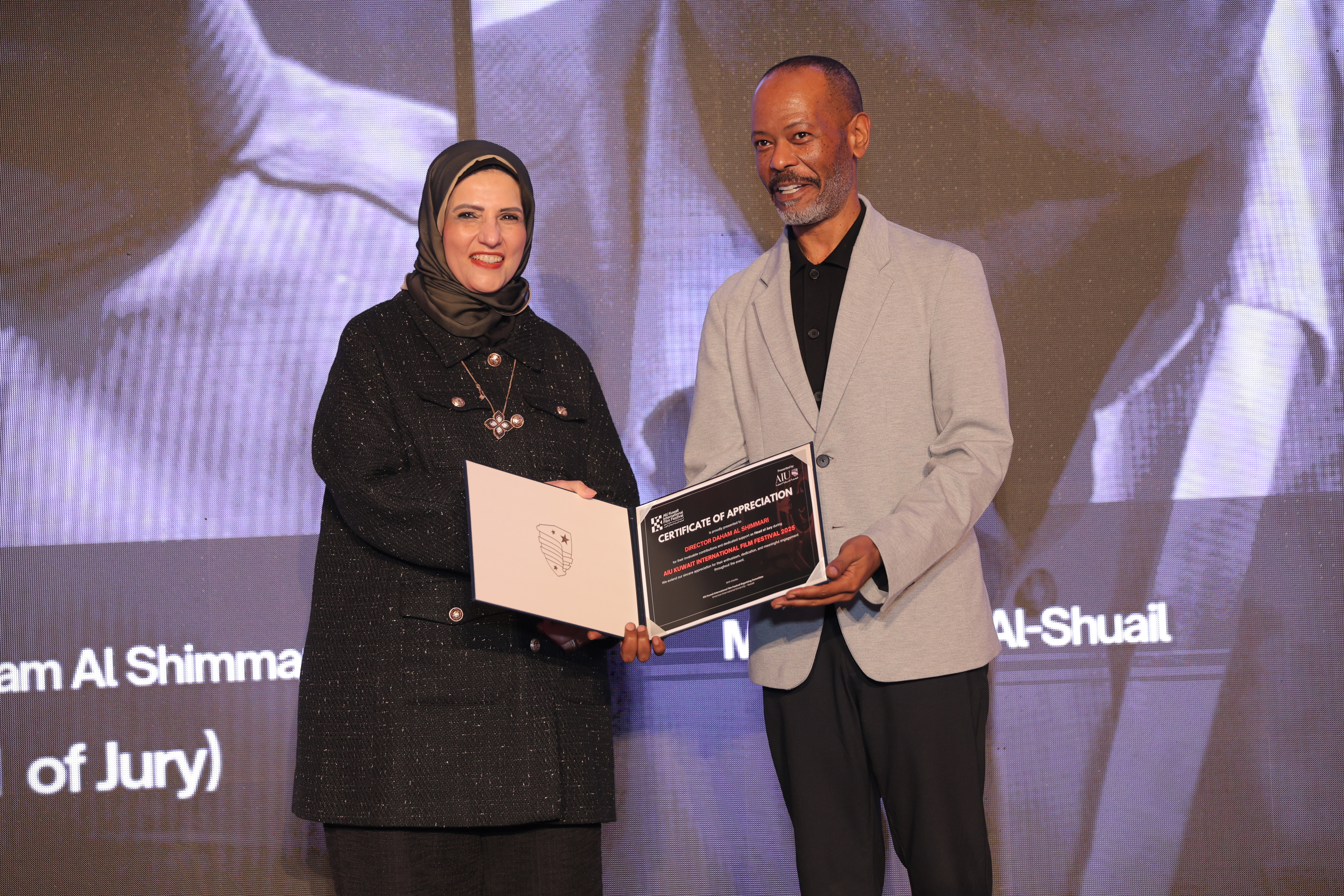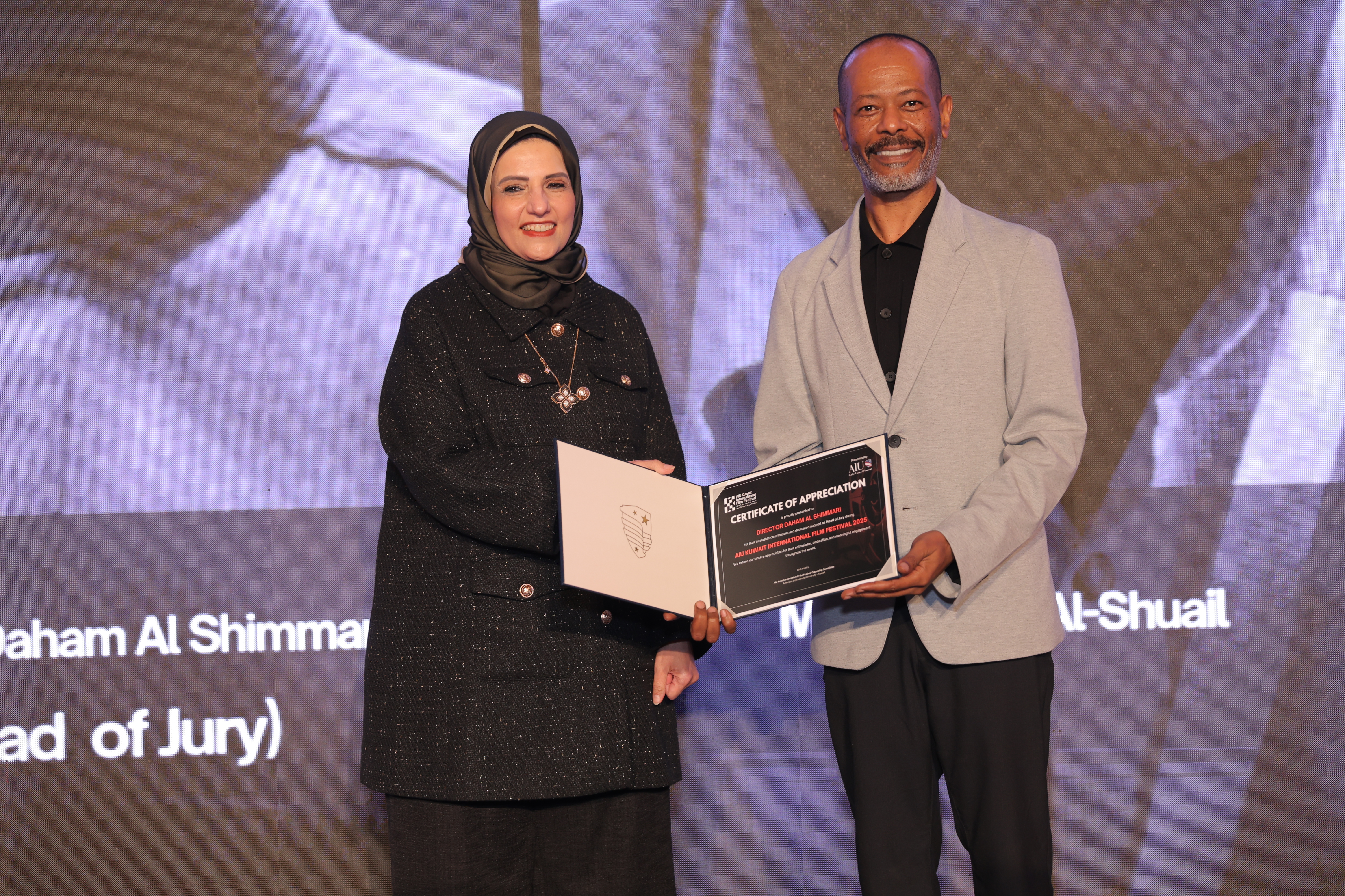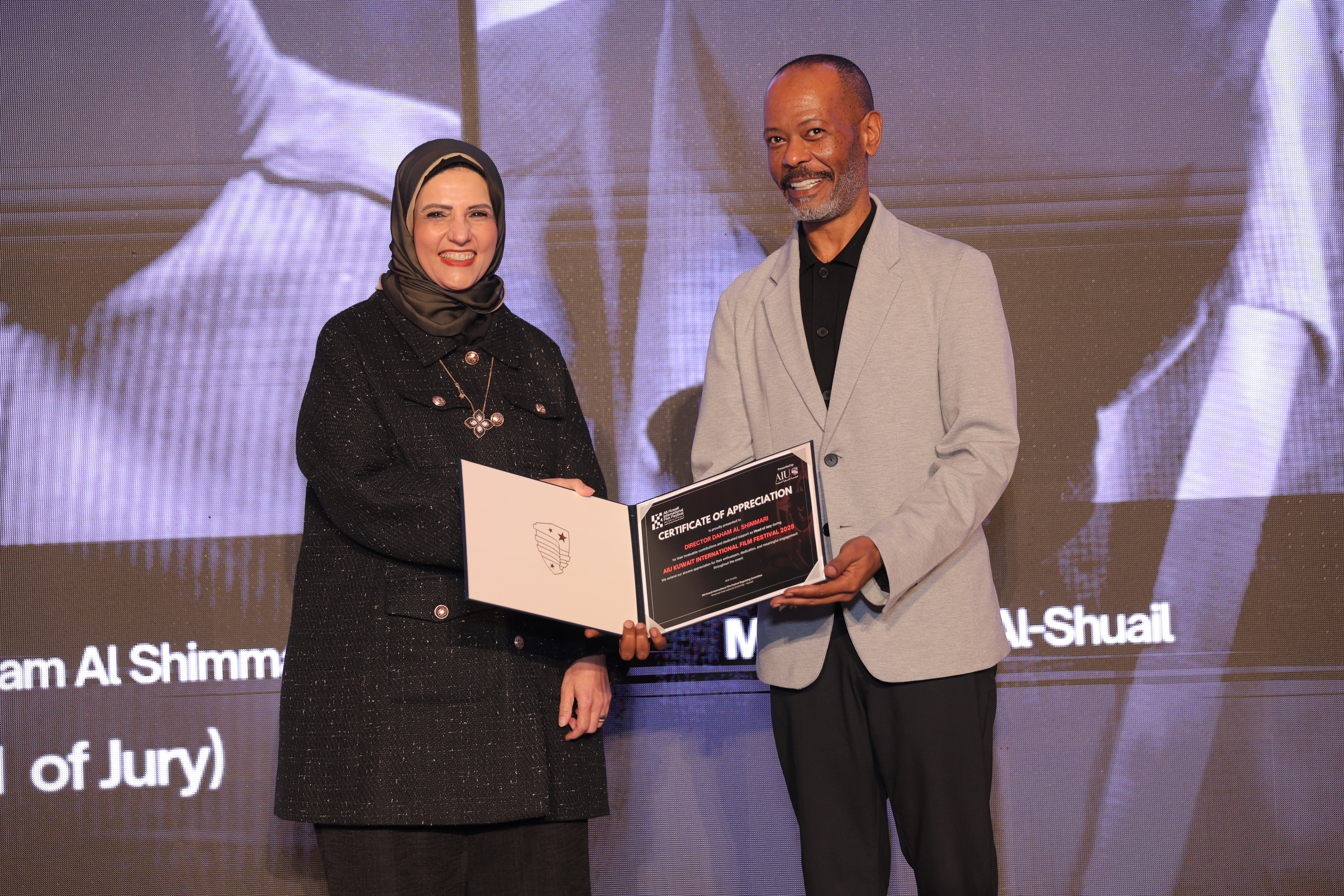 AIU Kuwait International Film Festival, Day 06 Images, Award Ceremony, Kuwait Film Industry, GCC Films, AIU Event, AIU Campus, Certificate of Appreciation, Daham Al Shimmari, Mrs. Areej Al-Ghanim