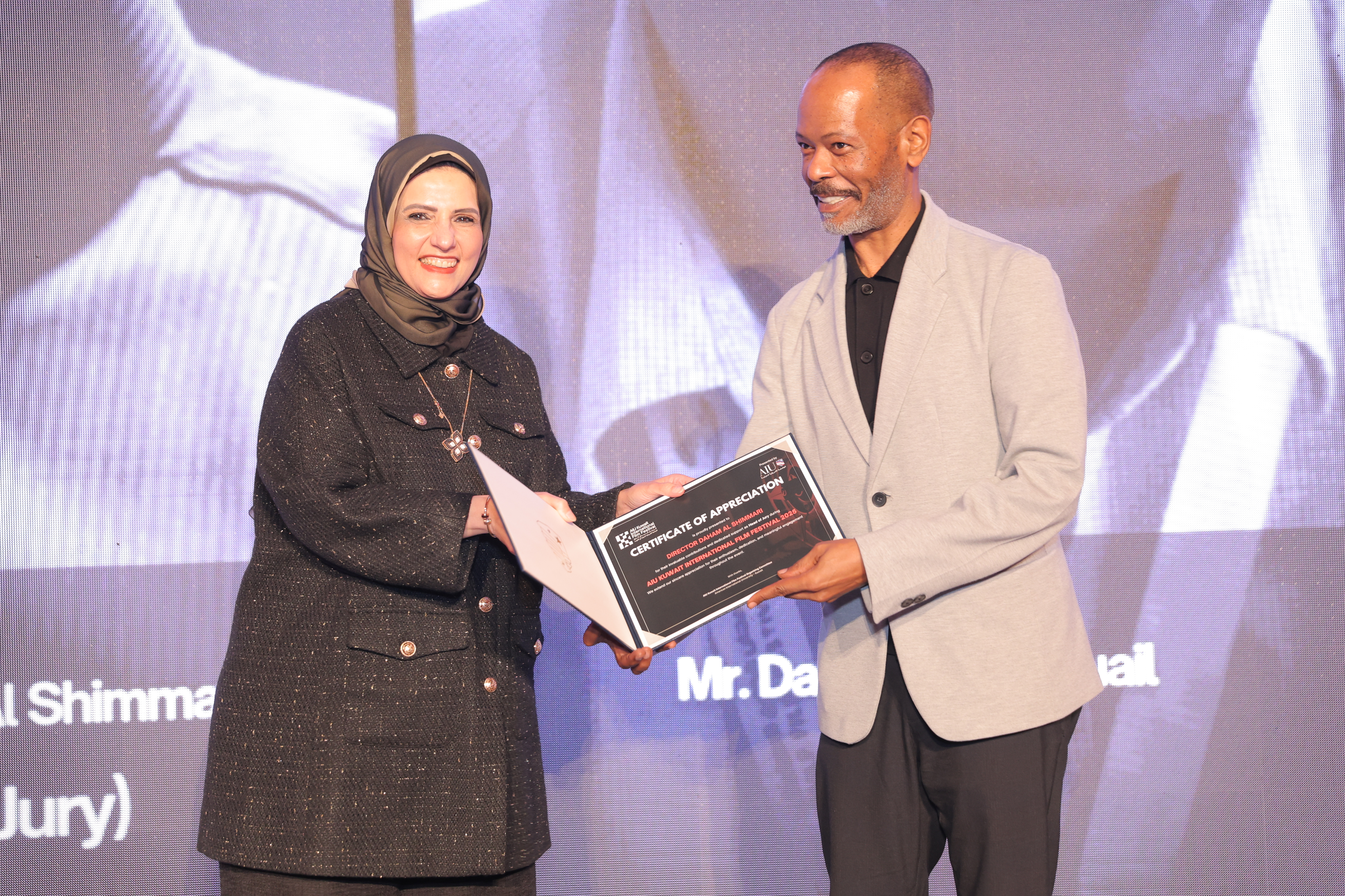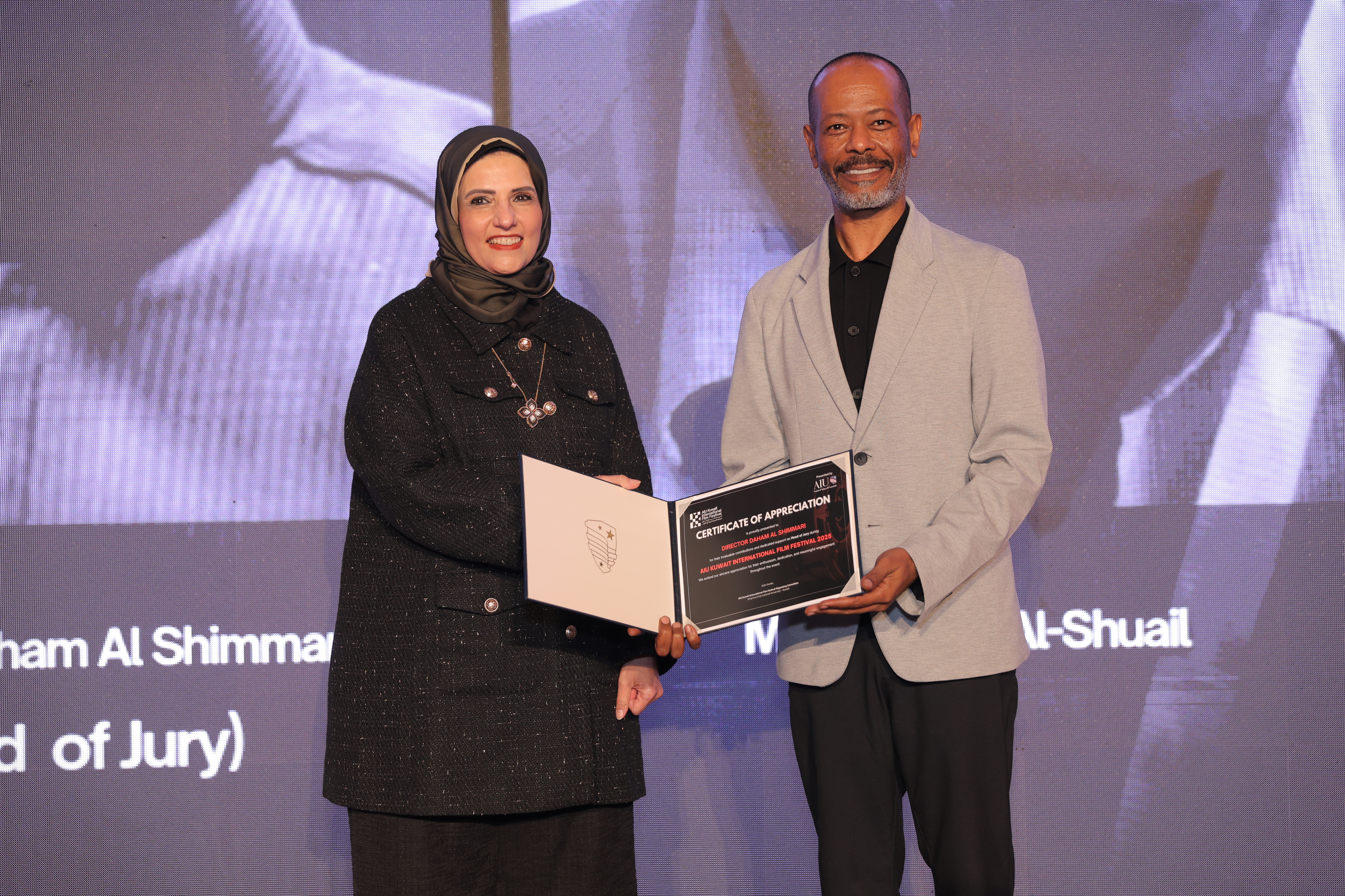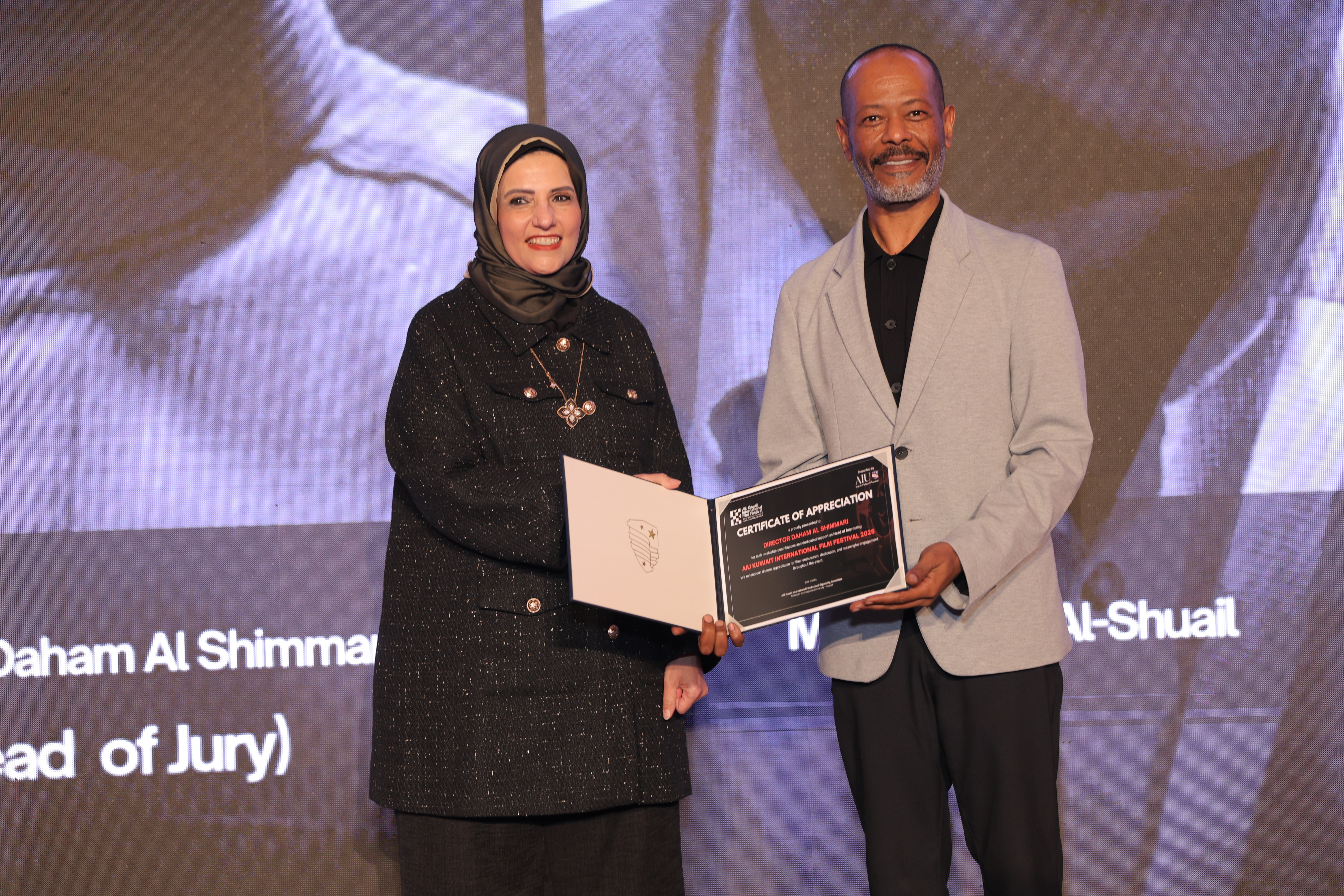 AIU Kuwait International Film Festival, Day 06 Images, Award Ceremony, Kuwait Film Industry, GCC Films, AIU Event, AIU Campus, Certificate of Appreciation, Daham Al Shimmari, Mrs. Areej Al-Ghanim