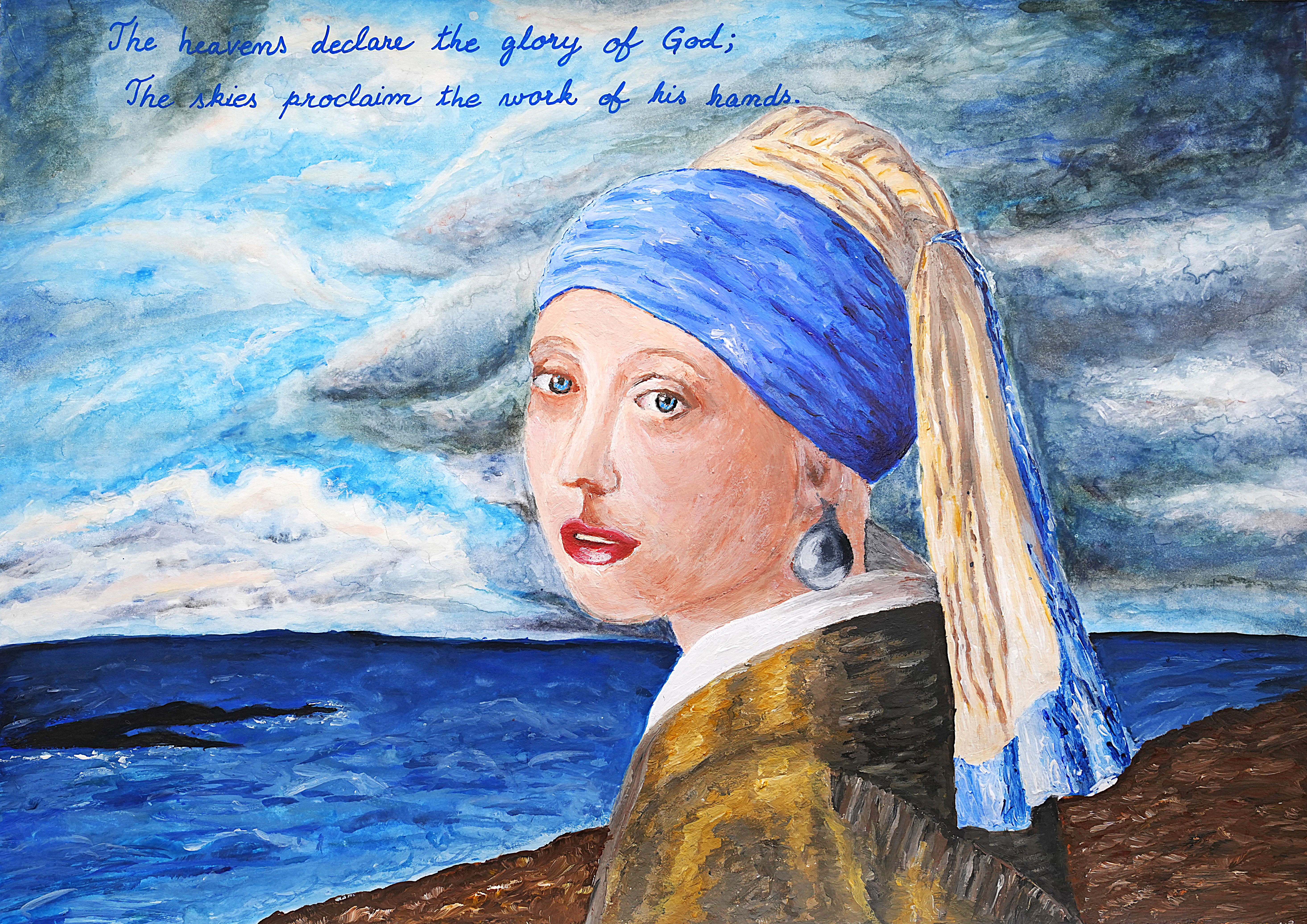 This painting is a beautifully symbolic composition that intertwines nature, humanity, and spirituality, creating a visual representation of life's profound mysteries. Inspired by Girl with a Pearl Earring, the artwork reimagines the iconic figure within a vast, stormy landscape, reinforcing the connection between human emotion and the elements of nature.
